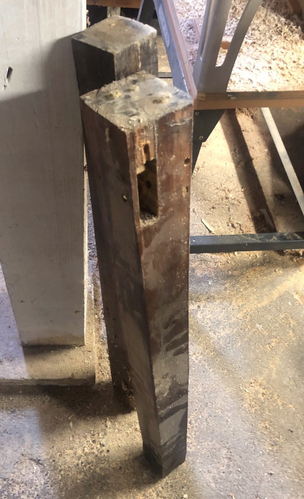The teak boards cam from the legs of an old desk. Here is a photo of a few of the legs before they were dimensioned and glued up.