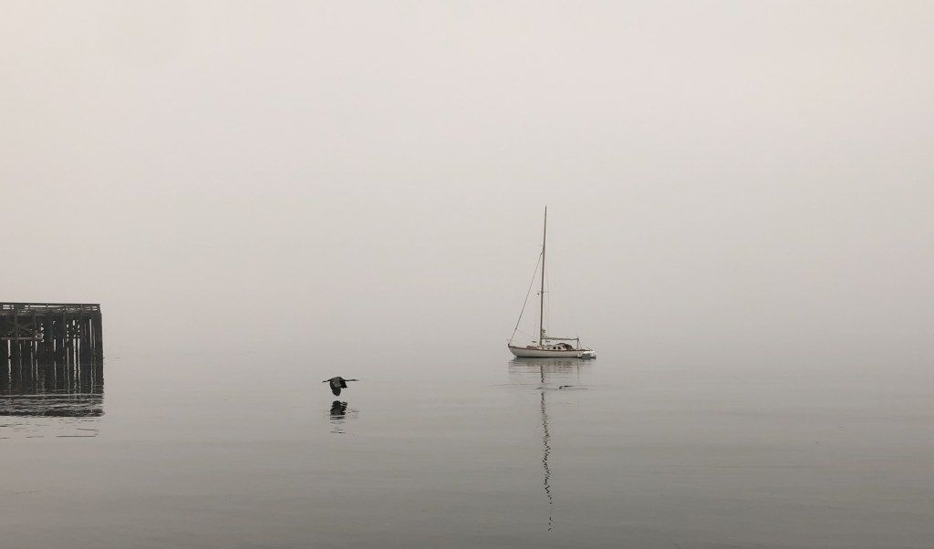 The KAPOW this week is a photograph from an early morning walk on the beach in Fort Worden State Park. The ubiquitous smoke (and fog) totally washed away any contrast between water and sky–where does one end and the other begin? The Great Blue Heron flying to the right, juxtaposed with the implied motion of the (anchored) sailboat to the left creates a story taking place in the row/zone across the photo framed by the pier. I tried a crop without the pier and the photo lost some of its life. The pier gives enough implied transition between water and sky to inform the rest of the scene and place it in context of the otherwise gradient background. The otters that were swimming just below the sailboat in the photo (the dots in line with the heron) wanted to be in the story as well……we will leave them out of this story. They have a story of their own here.