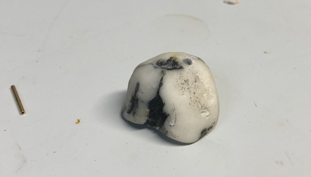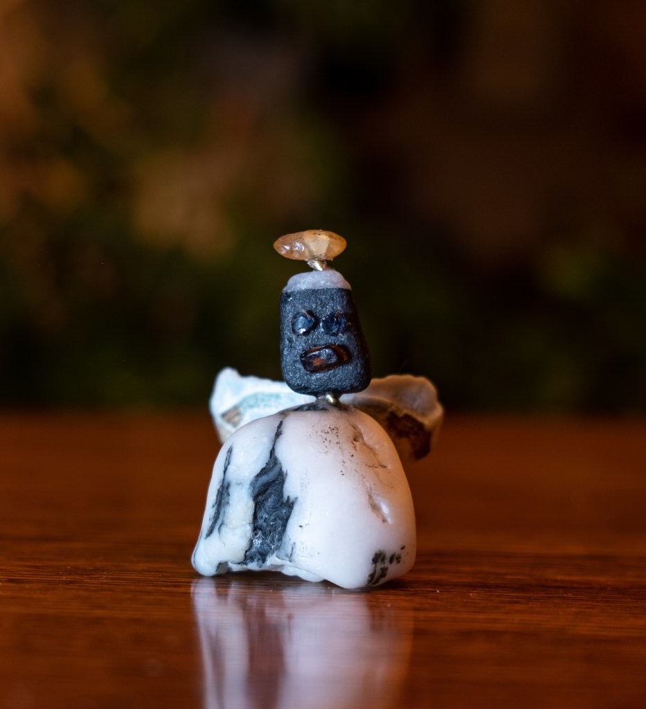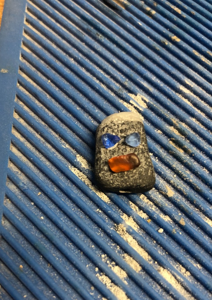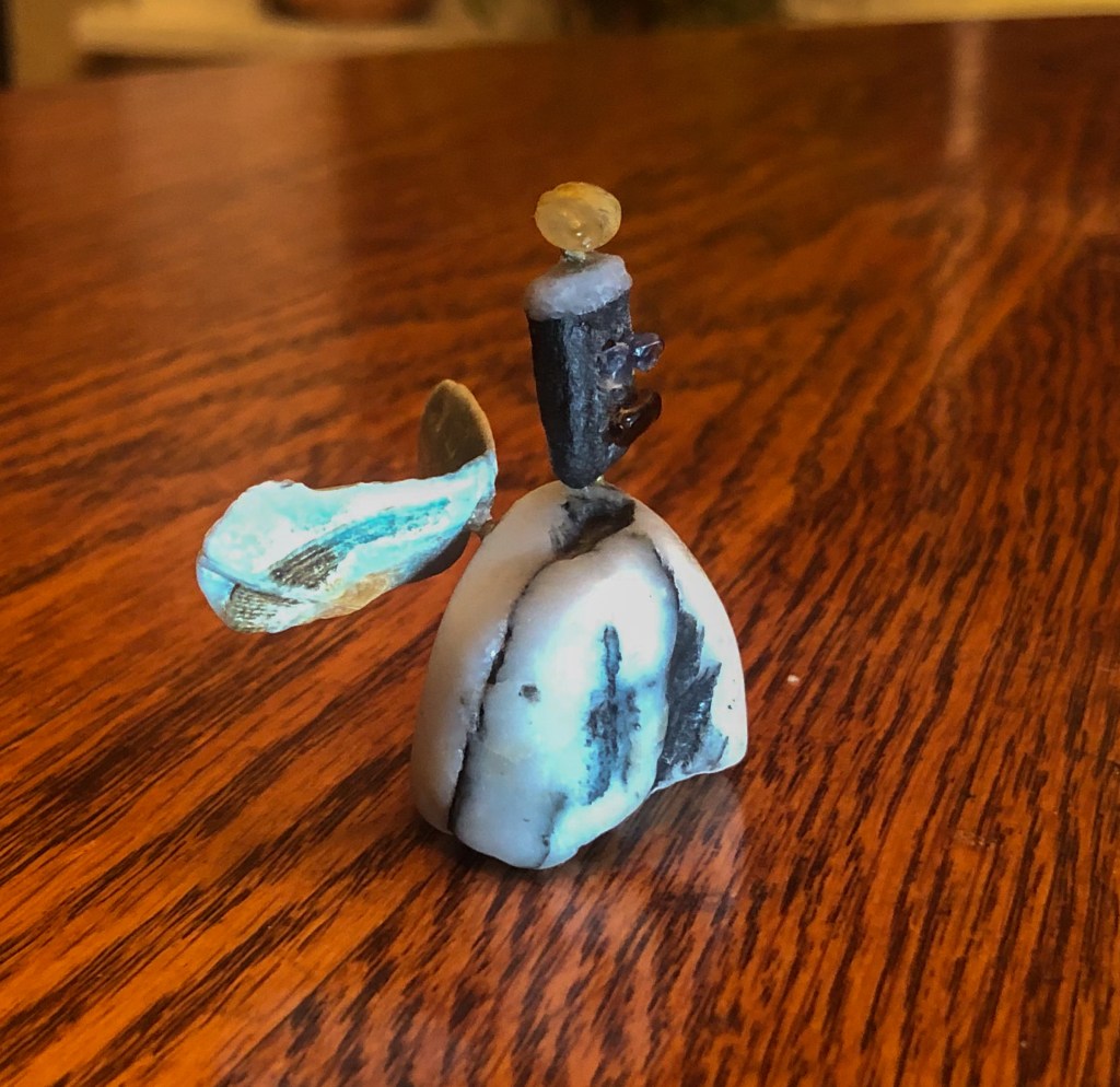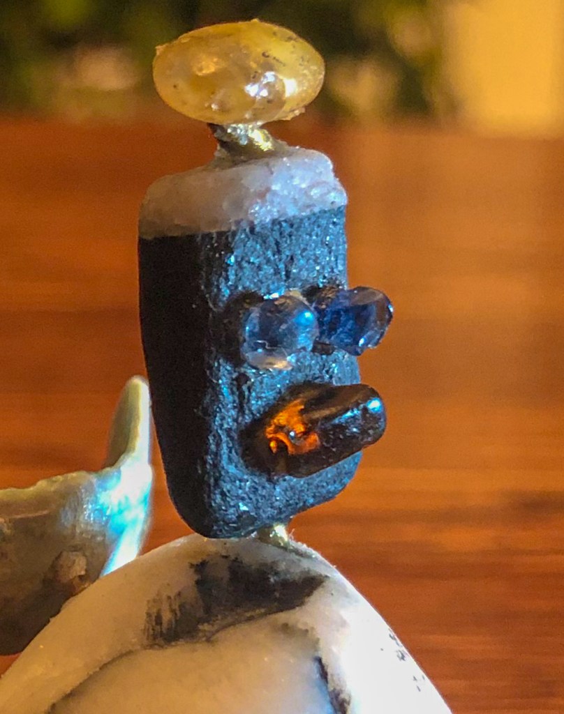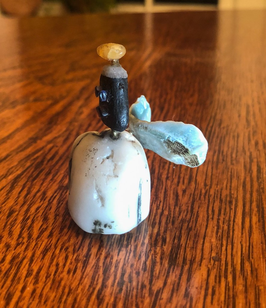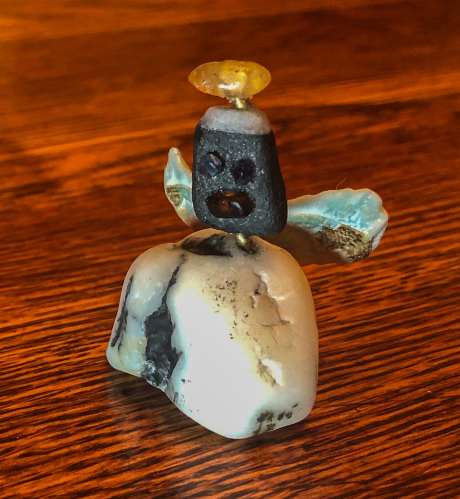 This week’s KAPOW is a sculpture of found beach objects put together as Beach-y Angel. Consisting of two rocks, a shell, and several different colors of sea glass, Beach-y Angel is held together with some small brass rod and epoxy. I recommend that anyone trying to carve/drill holes into (sea) glass or rock—get true carbide cutters.