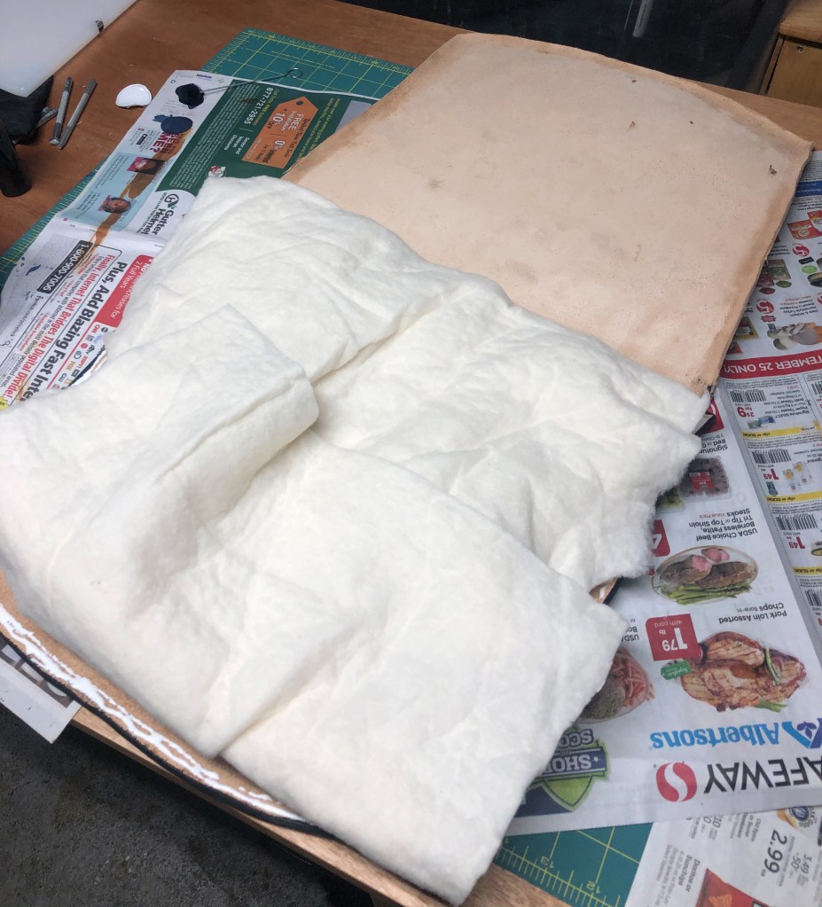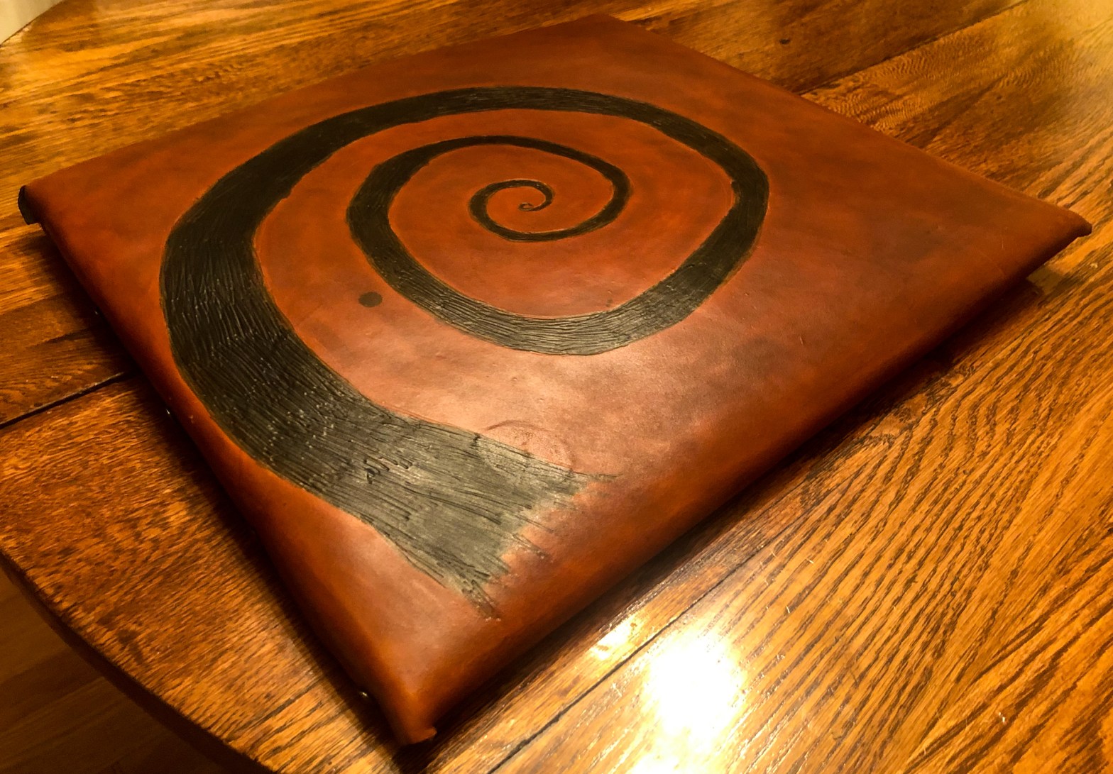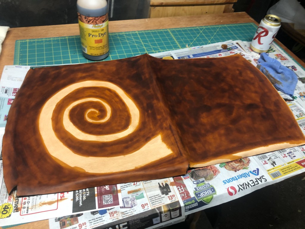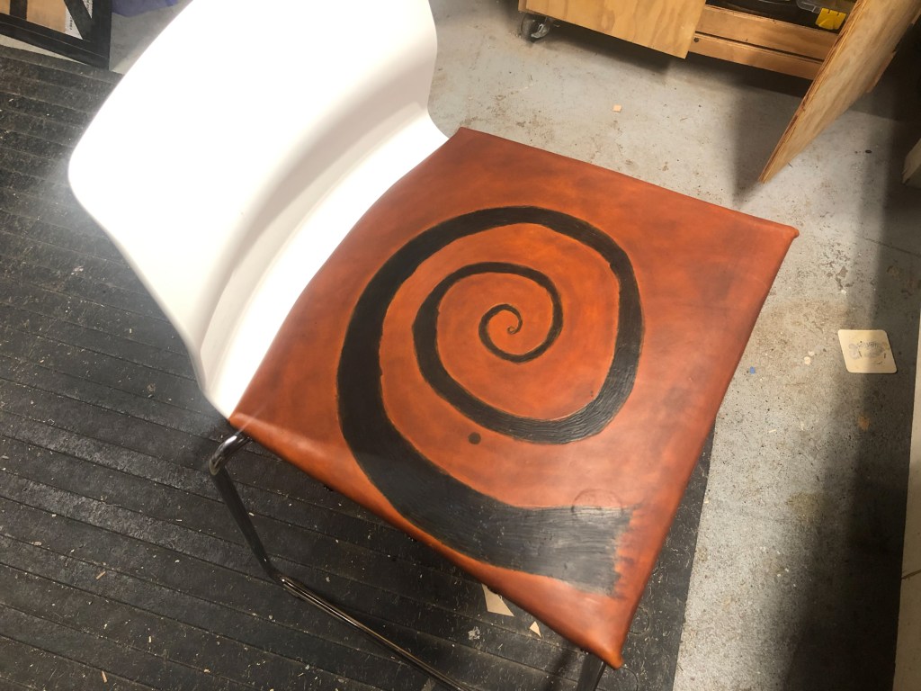 The KAPOW this week was to make a leather seat pad for a very hard Ikea stool that I have been using at the computer desk. The stool needed something to alleviate the pressure points. This is the second large-ish leather project I have done in the last few months, and I have learned a lot about making patterns, planning ahead, knowing where to place your fasteners ahead of time, and that I need to learn more about applying dye and colors. The swirl was added as a decorative motif–I like swirls. I am curious if it will leave an indentation.