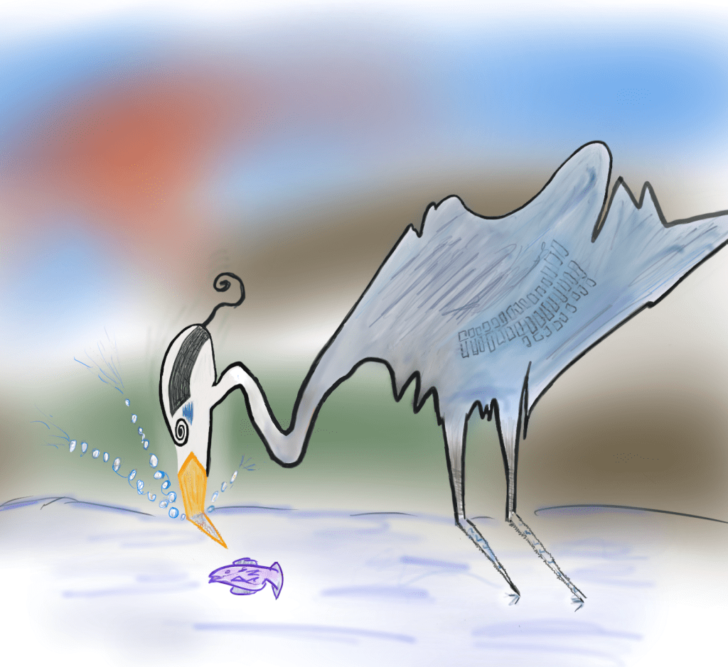 I have been watching Great Blue Herons hunt on the beach quite often in the last few months. Utterly still….and then….KAPOW! They strike their prey in the water. I tried to capture some of that energy here. The flatness of the body, the abstract background, and the refraction of the legs and beak juxtapose with the motion and starkness of the heron’s head–the left side of the painting versus the right side.