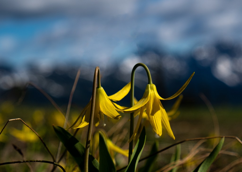The bustling field of Avalanche Lilies up on Tyler Ridge had not yet fully inverted, but made for a spectacular site—all askew in various directions. That should be Mount Townsend and Buckhorn Mountain blurred out in the background. Taken roughly from: 47°54’08.5″N 123°09’21.2″W.
