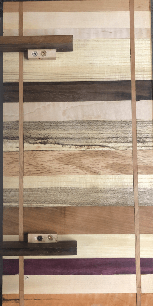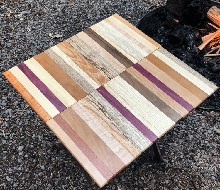As mentioned above, I built the table a couple of weeks ago. I put a thick coat of epoxy resin on the top I made….and it was kind of a disaster. So, this week for the KAPOW, I built this new top of out strips of varying woods. It came out looking nice.