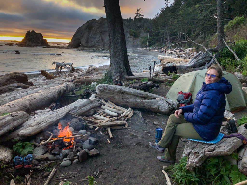 A snapshot of a campsite, or something more? The dramatic light and sunset over the beach /ocean juxtaposed with the tranquil campsite setting all come together to tell a story–the story of a great campsite.
